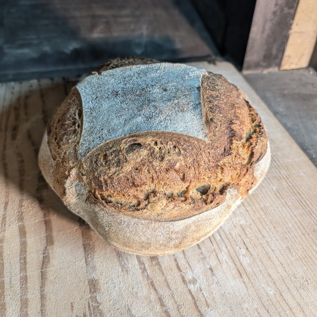国産有機栽培小麦、国産有機栽培ライ麦、天日塩と水のみを使い薪窯で焼いたカンパーニュです。